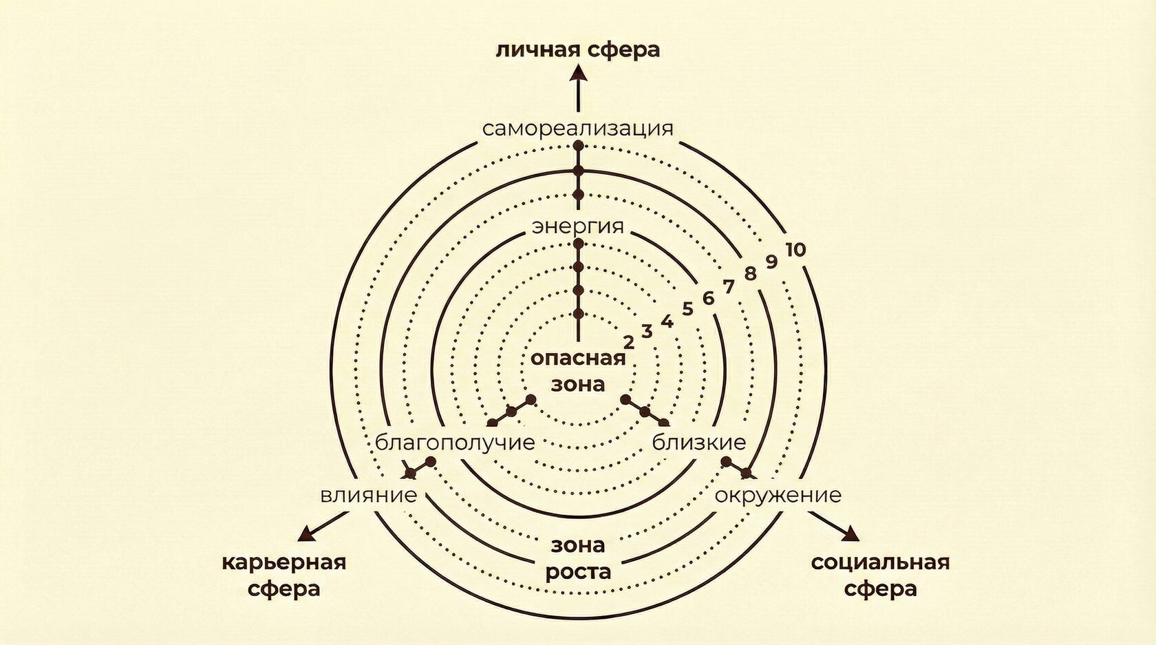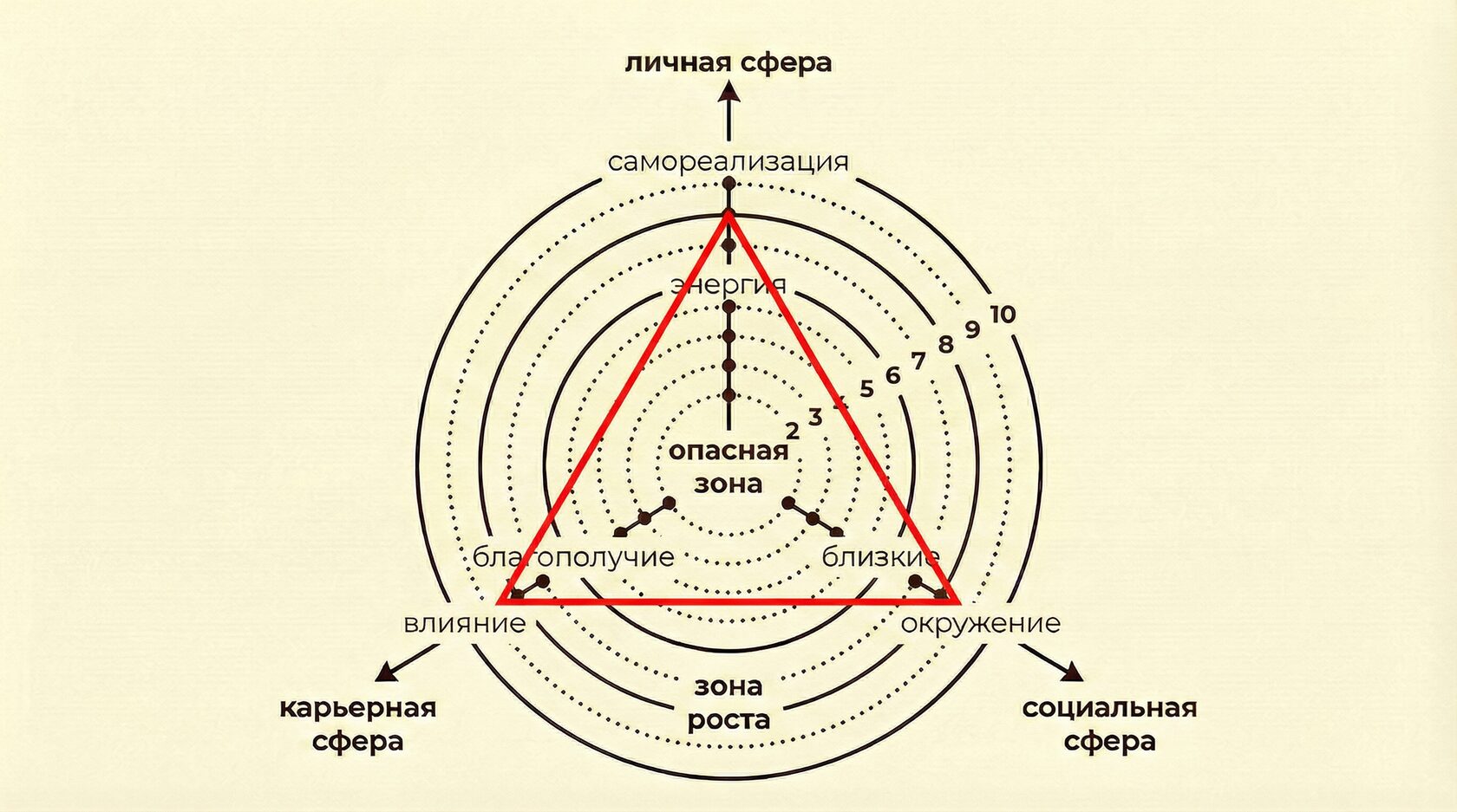 Внутренний круг — это фундамент для гармоничного развития. Он обеспечивает безопасность и комфорт. Если вы не удовлетворили базовые потребности, мозг включает отдел безопасности и все планы накрываются медным тазом. Не доводите сами себя, выбирая новые цели, сверяйтесь со своим компасом. Если вы в опасной зоне, то сфокусируйте внимание на выходе из внутреннего круга, а не на прокачке внешнего.